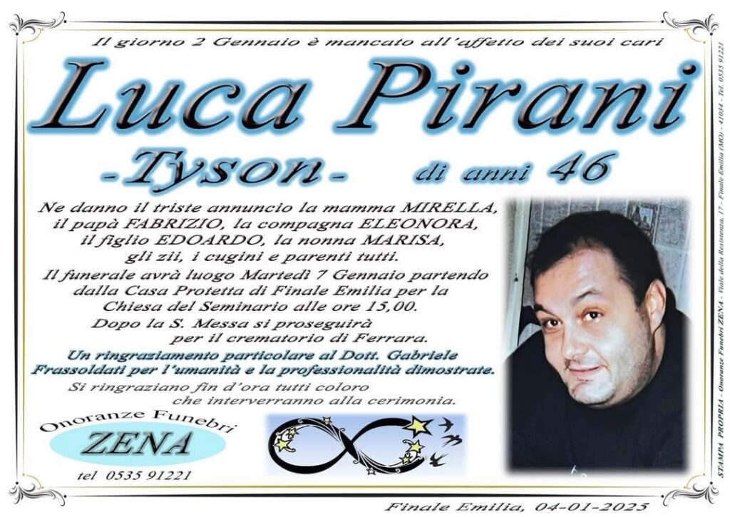 Conosciuto con il soprannome di "Tyson", Pirani lascia mamma Mirella, papà Fabrizio, la compagna Eleonora, il figlio Edoardo e la nonna Marisa.
