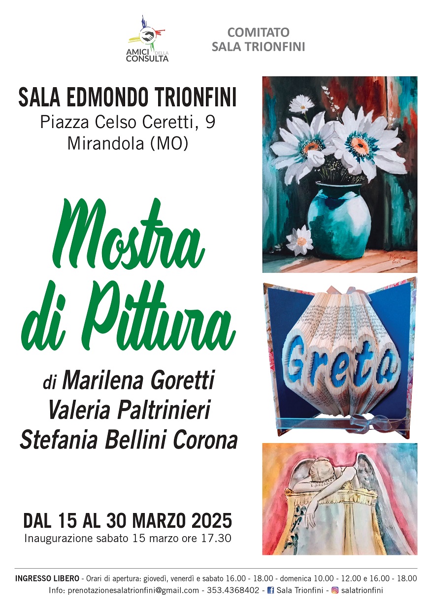 Giovedì 20, Venerdì 21 e Sabato 22 marzo 2025 dalle 16.00 alle 18.00: MOSTRA DI PITTURA di MARILENA GORETTI, VALERIA PALTRINIERI, STEFANIA BELLINI CORONA