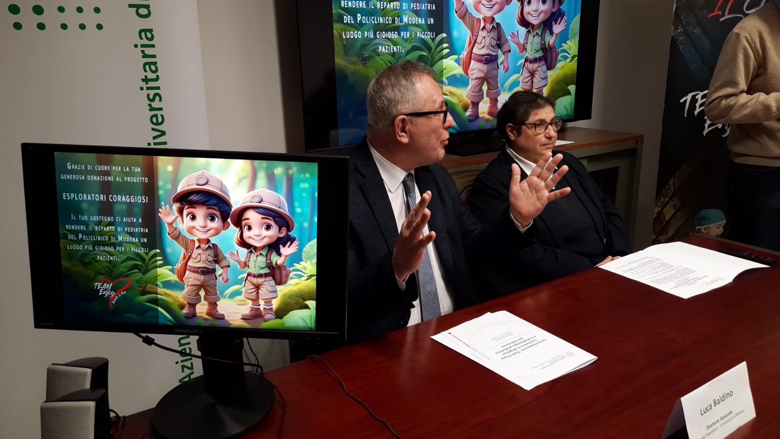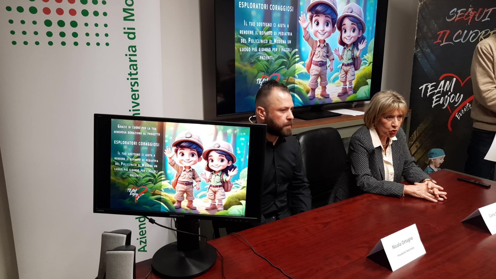 MODENA - Nel settembre scorso, Team Enjoy Events and Fun ha lanciato il nuovo progetto Esploratori Coraggiosi per trasformare, grazie a pannelli colorati, in una jungla la RX viscerale e la sala di attesa della Risonanza Magnetica al piano seminterrato del Policlinico, che viene utilizzata dai bambini in cura al Policlinico. In un secondo momento, tali stampe digitali montate a parete raffiguranti personaggi fantastici abbelliranno anche tutte le degenze di Pediatria. L’iniziativa rientra tra i progetti di umanizzazione delle cure promossi dall’Aou di Modena ed è stata sostenuta da Team Enjoy, grazie anche alla raccolta fondi organizzata da Conad Nord-Ovest. I disegni sono realizzati da un professionista grafico e installati da una ditta specializzata e quindi hanno tutte le caratteristiche necessarie a essere posizionati all’interno di una struttura ospedaliera. Oggi, i lavori in Radiologia sono conclusi e sono stati mostrati alla cittadinanza nel corso di una conferenza stampa. Il progetto è stato possibile grazie a un investimento complessivo di 6.620, 3.170 sono stati raccolti da Conad Nord-Ovest, 3000 euro da Team Enjoy, grazie agli eventi della scorsa estate. Il rimanente è frutto delle donazioni degli stessi professionisti della Radiologia.