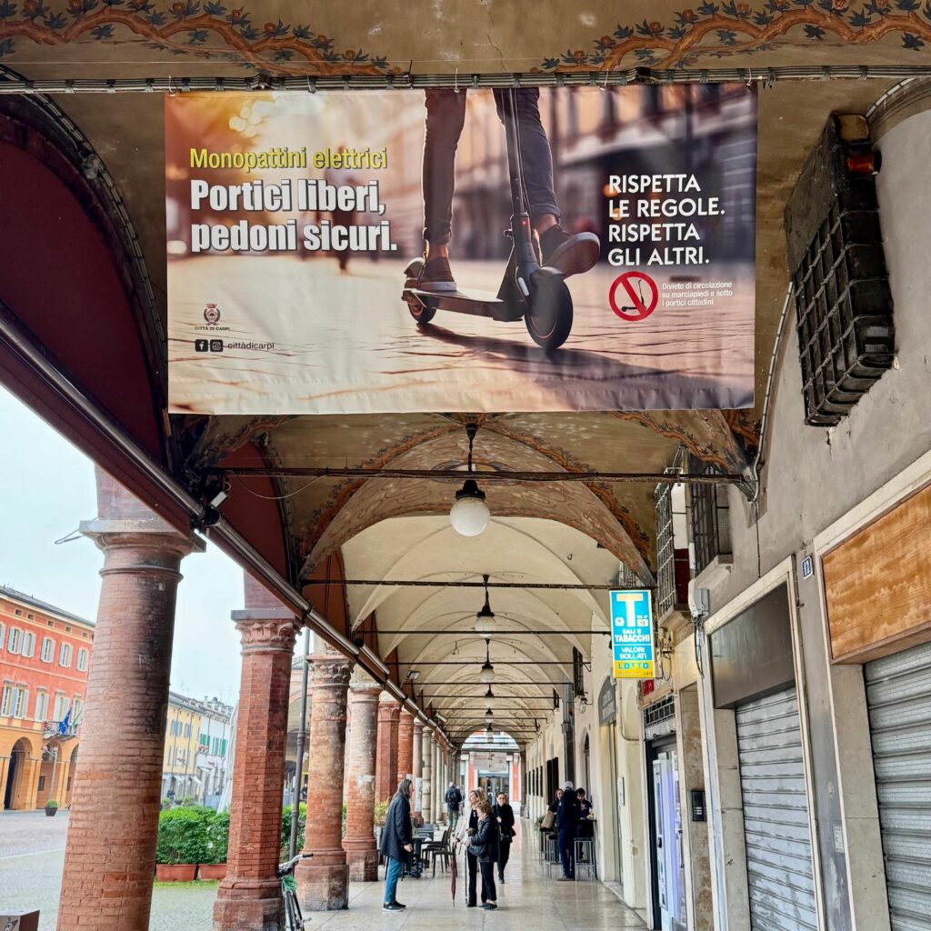 Il decoro urbano e la sicurezza dei pedoni sono il doppio obiettivo della campagna di sensibilizzazione promossa dal Comune di Carpi e partita oggi, lunedì 14 aprile, con l’esposizione sotto le arcate del portico lungo, in piazza Martiri, di banner bifacciali che, da un lato, invitano i cittadini di raccogliere i bisogni del proprio cane e, dall’altro, ricordano che è vietato circolare in bici e in monopattino sotto il portico e sui marciapiedi.