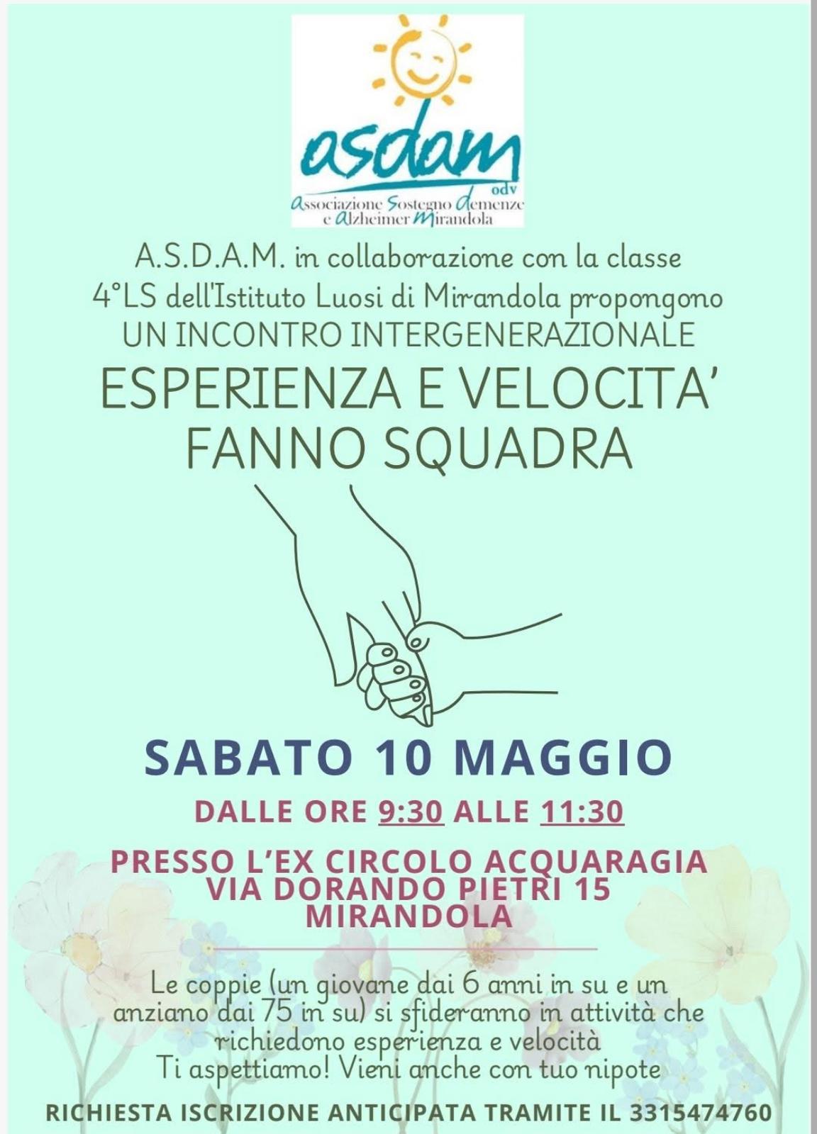 MIRANDOLA - L'Associazione Sostegno Demenze e Alzheimer di Mirandola (ASDAM), in collaborazione con la classe 4^ LS dell'istituto "Luosi", organizzano un incontro intergenerazionale dal titolo "Esperienza e velocità fanno squadra".